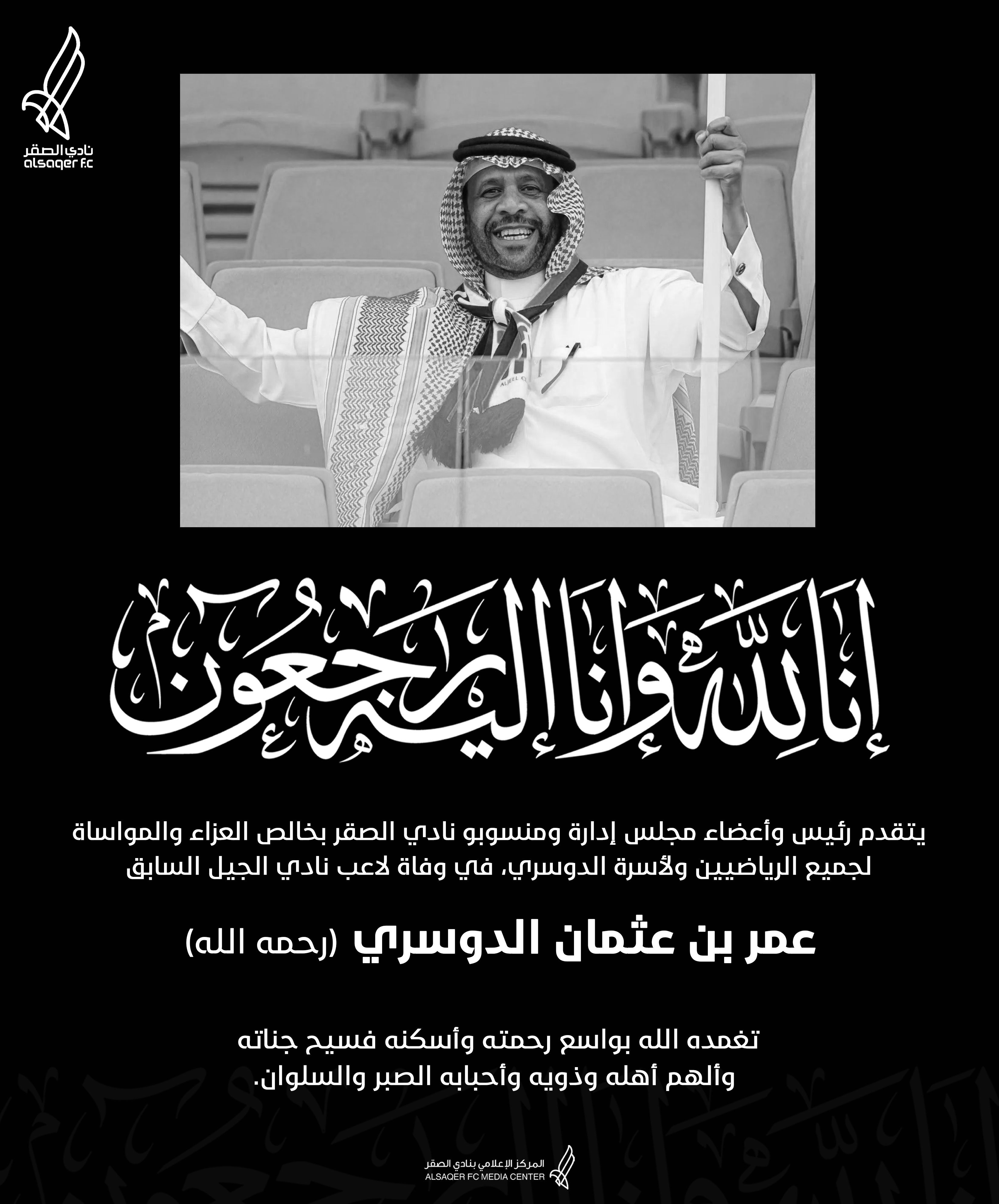 "تعزية" لجميع الرياضيين ولأسرة الدوسري، في وفاة لاعب نادي الجيل السابق عمر بن عثمان الدوسري -رحمه الله-. #نادي_الصقر