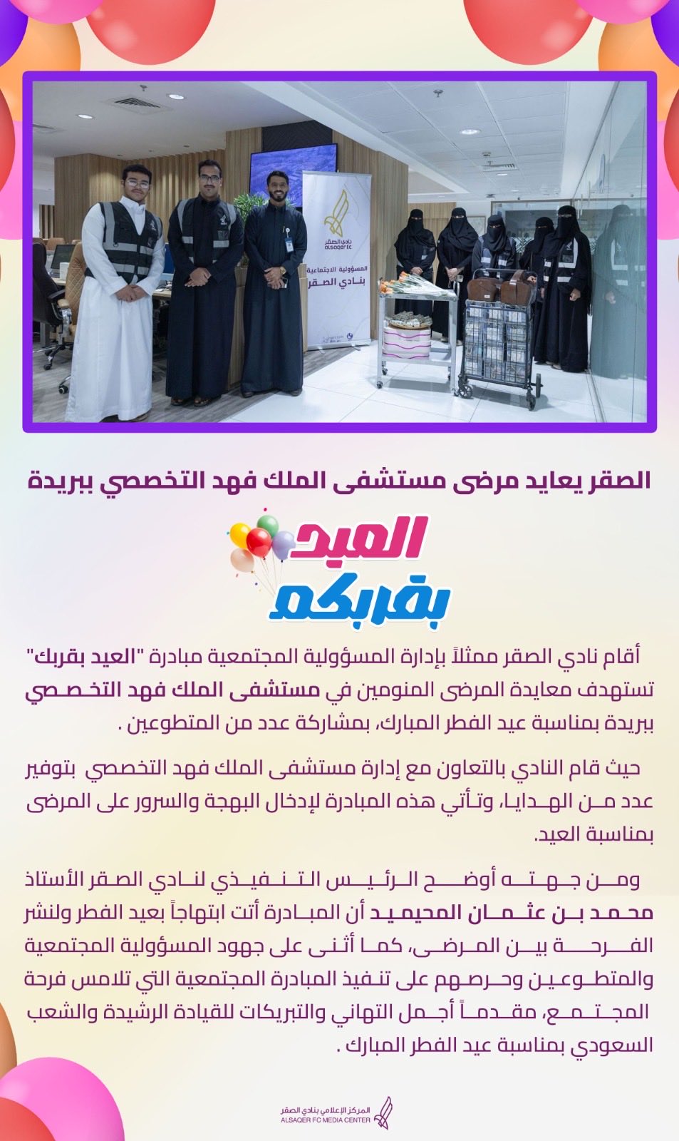 أخبار المسؤولية الاجتماعية 🟣 مبادرة العيد بقربك🎊 نادي الصقر 20 Mar 05:43 am عبر مبادرة 🎉 العيد بقربك 🎊 الصقر يعايد مرضى مستشفى الملك فهد التخصصي ببريدة #نادي_الصقر💜 #عيد_الفطر