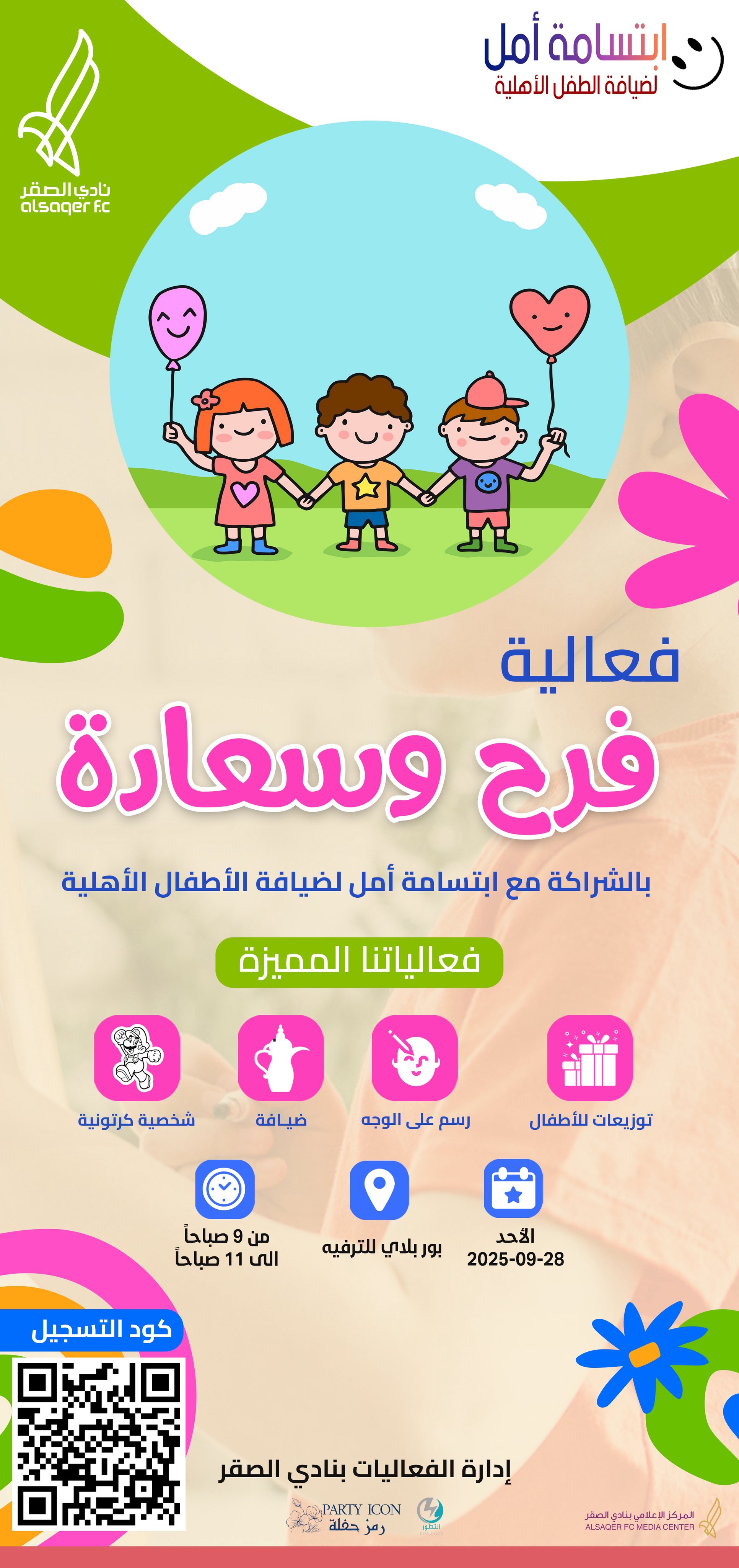 بالشراكة مع ابتسامة أمل لضيافة الأطفال.. تقيم إدارة الفعاليات بـ #نادي_الصقر فعالية ترفيهية بعنوان "فرح وسعادة". 🎨 رسومات 🤹 ألعاب للأطفال 🎁 توزيعات ☕️ ضيافة لتسجيل أطفالكم عبر الرابط: https://t.co/aWU2ID0Jzf