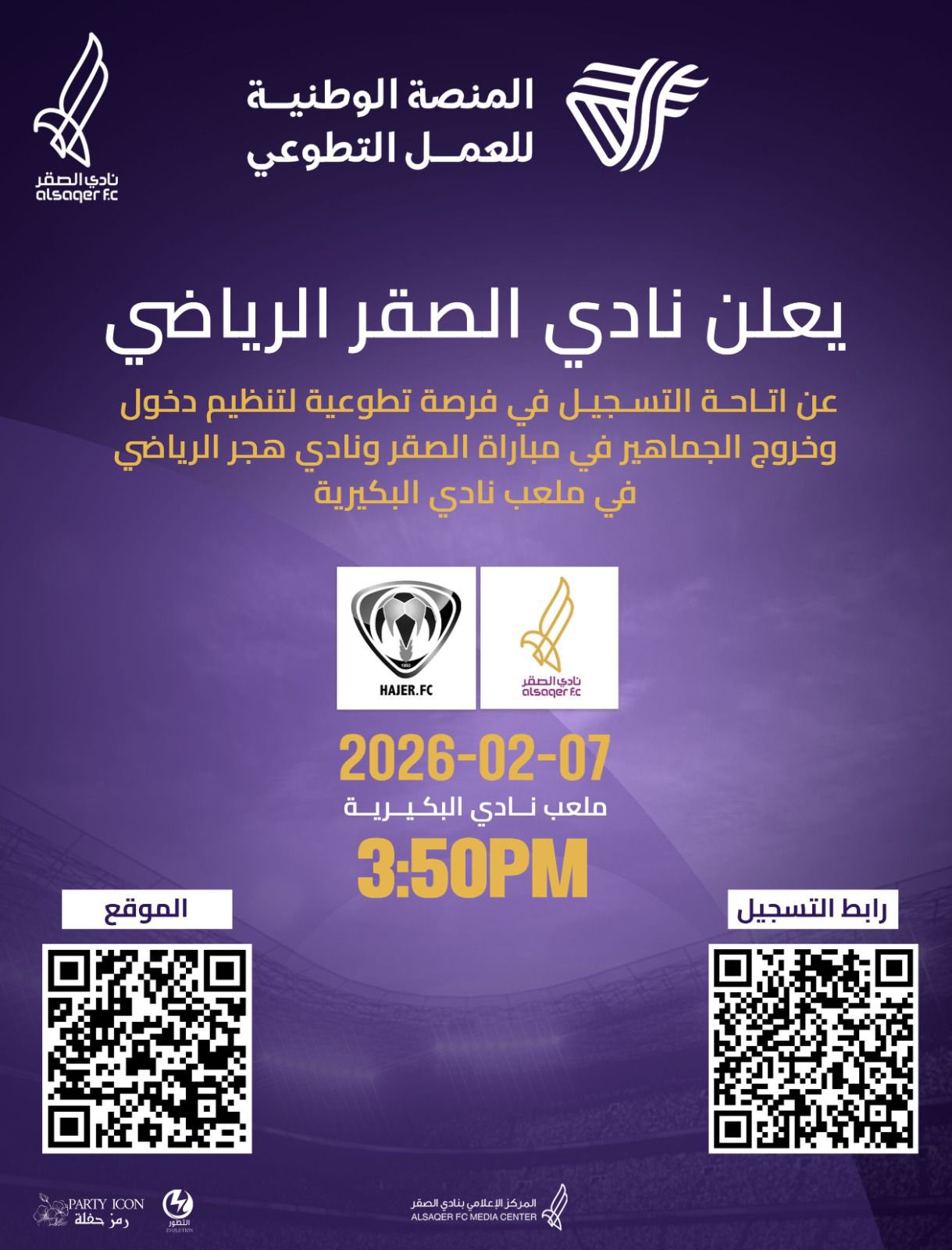🤝 فرصة تطوعية في مباراة الصقر القادمة.. انضم معنا وساهم في تنمية العمل التطوعي. للتسجيل⤵️ nvg.gov.sa/public/vol-opp… #نادي_الصقر💜