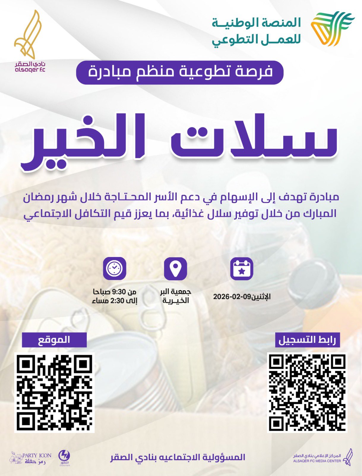 تعزيزاً لقيم التكافل الاجتماعي 🤝 يطرح نادي الصقر فرصة تطوعية للمشاركة في مبادرة "سلات الخير" بالتعاون مع @bir3388 للتسجيل عبر الصورة أو الرابط: https://t.co/yYgDK5VStV