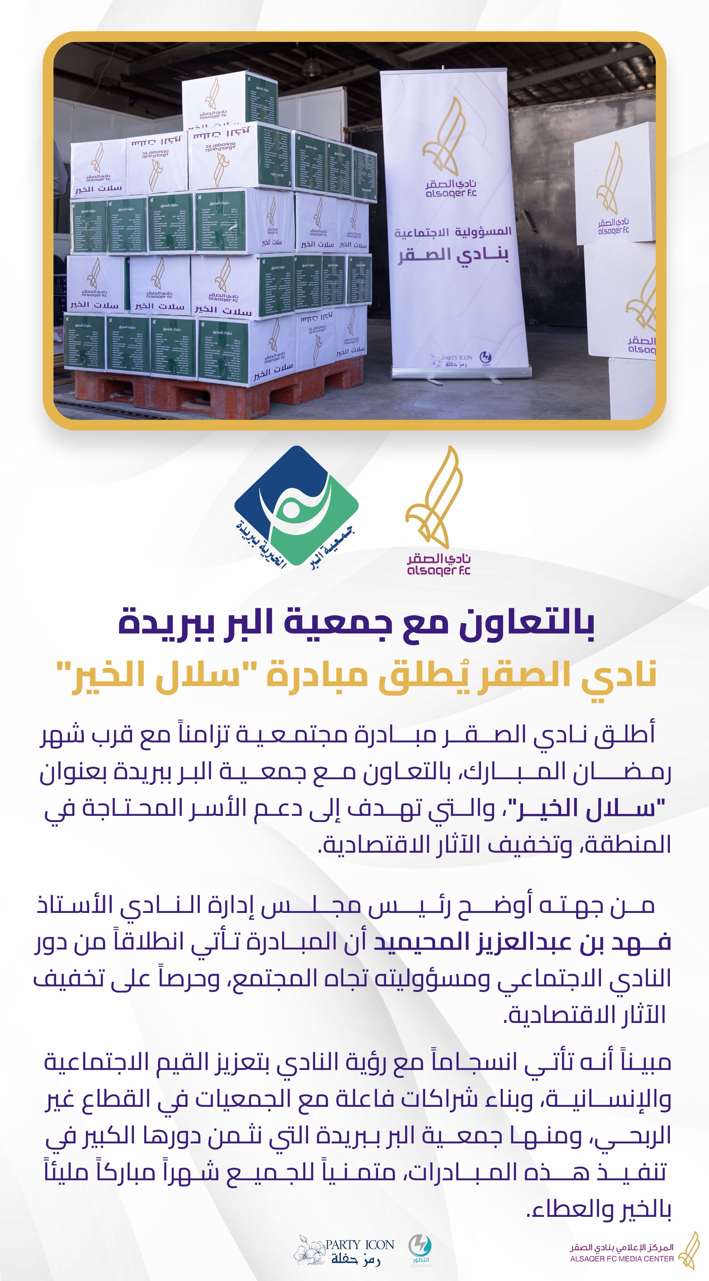 أخبار المسؤولية الاجتماعية 🟣 إطلاق مبادرة سلات الخير 🤝 نادي الصقر 10 Feb 11:51 pm بالتعاون مع جمعية البر بـ #بريدة #نادي_الصقر يٌطلق مبادرة "سلال الخير"